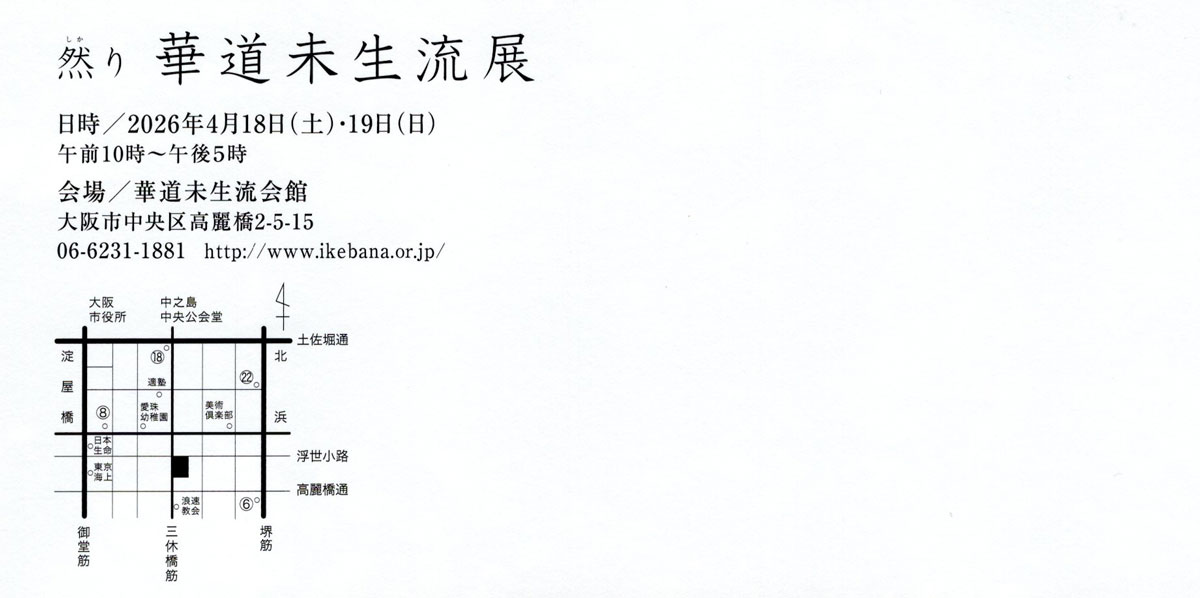 2026年4月18日(土)19日(日)10am~5pm 会場/華道未生流会館 大阪市中央区高麗橋2-5-15 入場無料